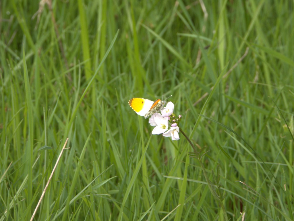 When I ducked out of the hide I was delighted to spy and Orange Tip Butterfly. She danced in front of me for a brief moment before obligingly settling onto a flower. She held me captive for that second, batting her colourful wings and displaying the array of patterns below her wing tips. Butterflies have always defied me when I have my camera and will often move at the last moment, dissapearing from sight so I was quite pleased to manage this shot.