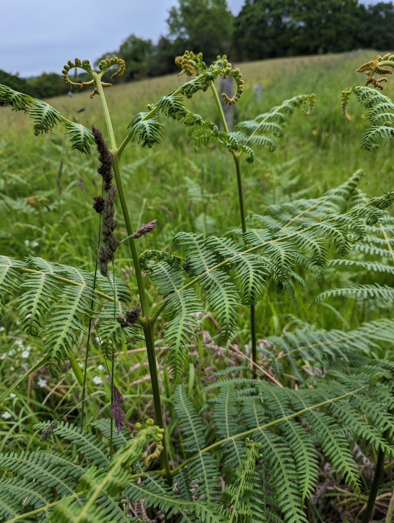 Bracken (Pteridium) is a fascinating plant. It can reproduce with a mix of asexual and sexual reproduction. Existing colonies of bracken will simply spread using the fronds which spread out across many metres. New colonies however will actually spread by the dispersal of spores which will land and establish fiddleheads which are essentially new fronds and they are the curled up bits that look a bit like caterpillars you see in the edges of the leaves.
